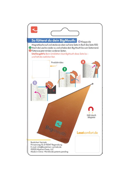 Du fütterst das Bigmouth einfach mit einigen Buchseiten und es bleibt beim Umblättern automatisch auf der richtigen Seite. Sogar, wenn du das Buch mal schnell zuklappst oder weglegst!